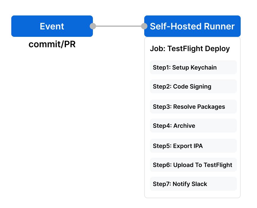 release/* 브랜치에 커밋 혹은 PR 발생 시, 자동으로 빌드, 테스트, 테스트플라이트로 배포되는 프로세스로, 릴리즈의 안정성과 신뢰성을 높일 수 있다. (수동 배포로 생기는 휴먼 에러 방지)