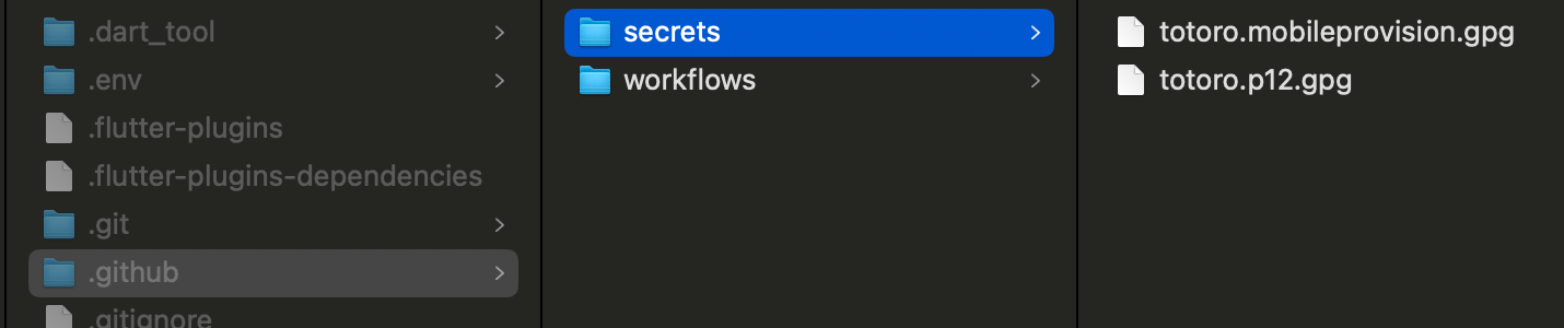 .p12.gpg파일과 .moblieprovision.gpg 파일은 .github/secrets 폴더에 저장해둔다.