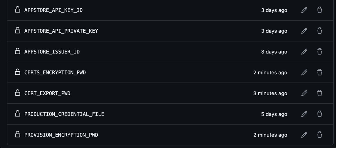 - PROVISION_ENCRYPTION_PWD : .mobileprovision파일을 gpg로 파일 암호화할 때 사용한 암호. 복호화할때 필요