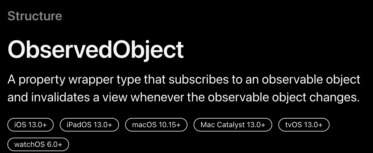 목차) SwiftUI의 기본 - 목차 링크 * @Published, @objecervableObject 개념은 Combine이므로, Combine 관련 이전 포스팅 글 참고 @ObservedObejct 란? observable 객체를 구독하는 property wrapper observable 객체가 변경되면 뷰